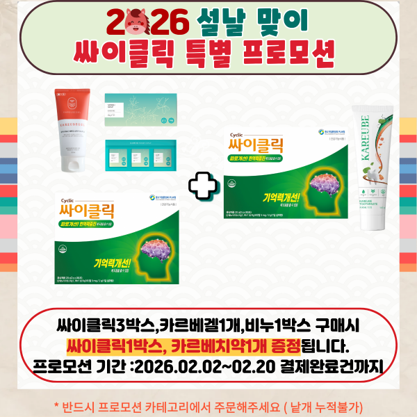 상품 구성 : 싸이클릭3BOX,카르베겔1개,카르베비누1BOX 소비자가: 685,100 회원가:527,000 CV:142,000 ▶추가 구성: 싸이클릭1BOX , 카르베치약 1개 소비자가 :225,400 회원가:173,000